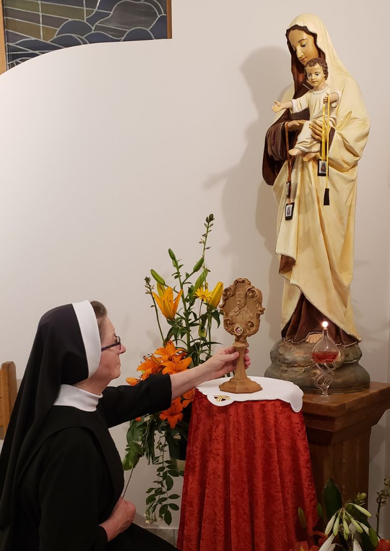 Dzięki życzliwości ojca proboszcza, późnym wieczorem relikwie błogosławionego Stefana nawiedziły również dom zakonny sióstr Terezjanek. Po przywitaniu relikwii wspólnotowo odmówiłyśmy Litanie do bł. Stefana Wyszyńskiego zawierzając naszą wspólnotę, nas same oraz nasze rodziny. Relikwie również nawiedziły nasze chore siostry, które nie mogły modlić się z nami w kaplicy.